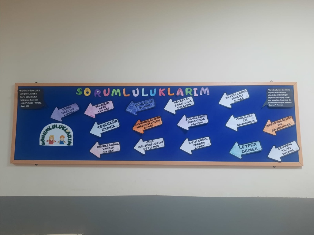 Ögrencilerimizin bireysel ve toplumsal sorumluluklarının farkına varmalari ve sorumluluk bilinclerini gelistirebilmeleri amaciyla pano çalışması yapılmıştır.