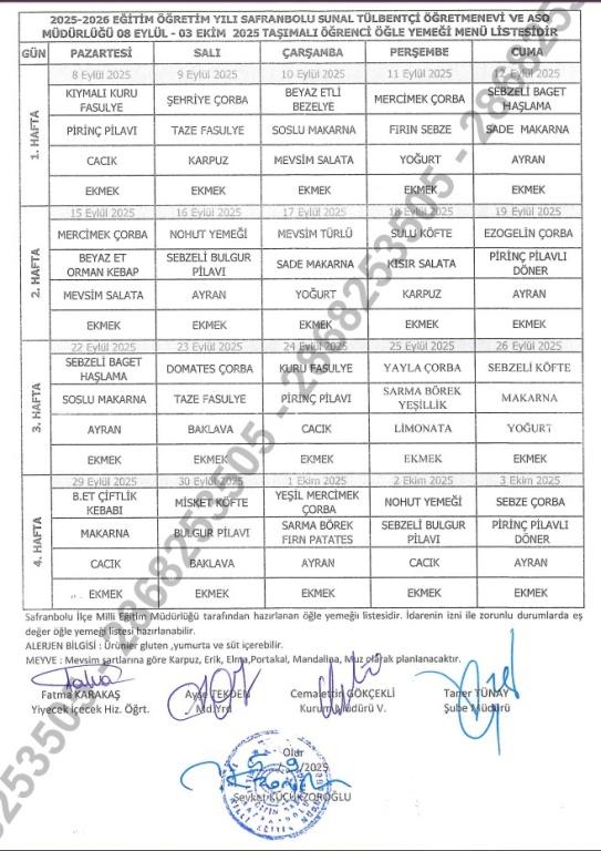 EYLÜL AYI TAŞIMALI YEMEK LİSTESİ